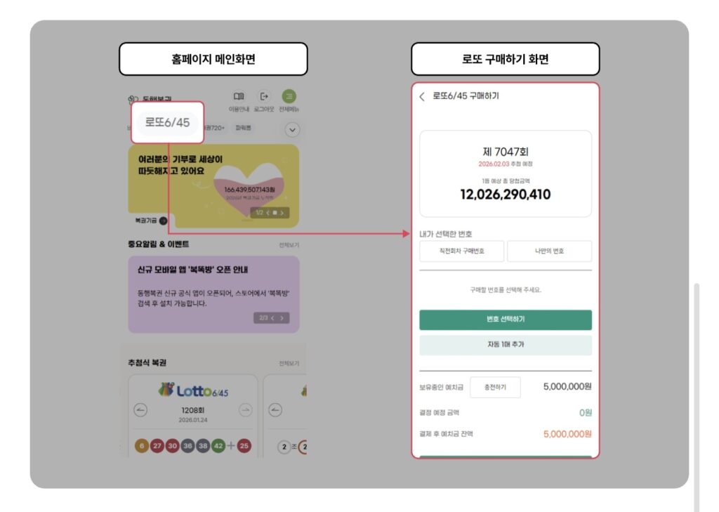 로또는 신용카드 결제가 불가능하며, 미리 충전한 ‘예치금’으로만 살 수 있습니다.