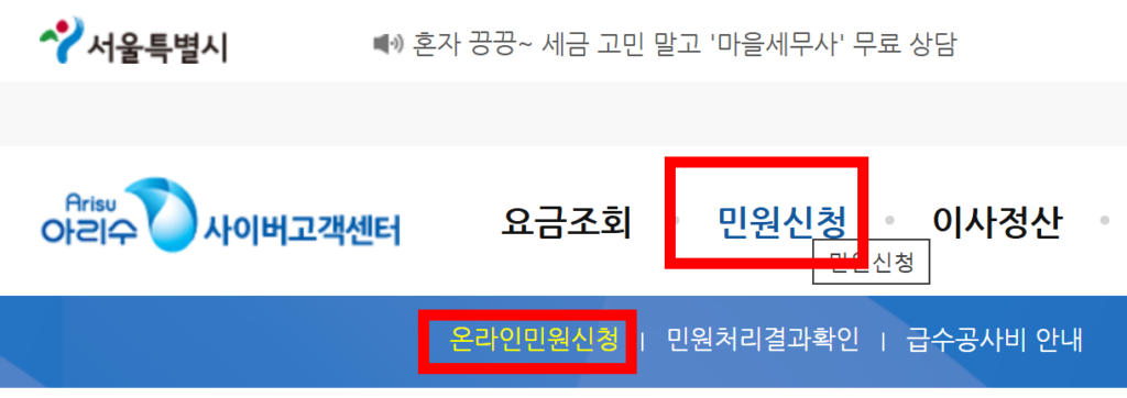 외출이 어렵다면 서울아리수본부 홈페이지 내 ‘아리수 사이버고객센터’를 이용하세요.