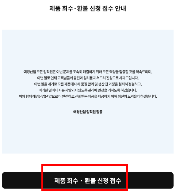 애경산업 공식 홈페이지에 접속해서 환불 접수 페이지로 들어가시면 돼요. 홈페이지 들어가면 아래와 같은 팝업창이 떠요. 회수 신청 버튼 누르면 바로 연결 되더라고요. 기간은 2025년 12월 29일 오후 5시 37분부터 시작해서 2026년 2월 13일 오후 6시까지 신청 가능해요.