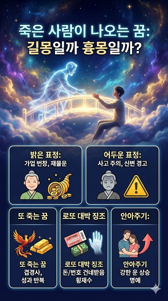 꿈 해몽학 관점에서 ‘죽음’은 결코 불길한 것만이 아닙니다. 오히려 과거의 나를 버리고 새로운 나로 태어나는 ‘재생’, ‘성취’, ‘행운’의 상징으로 해석되는 경우가 많습니다. 오늘은 상황별로 죽은 사람이 나오는 꿈이 어떤 의미를 담고 있는지 1,500자 분량의 상세한 가이드로 정리해 드립니다.