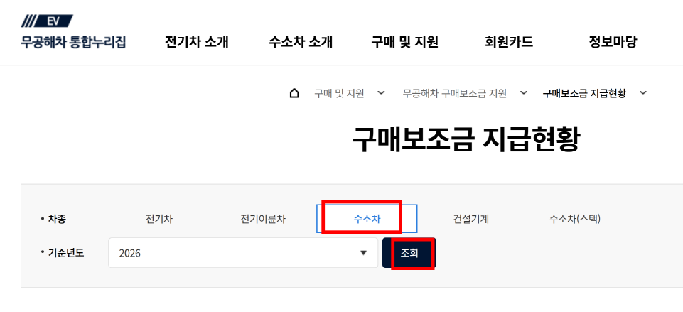 • 방법: 사이트 접속 -> [구매 및 지원] -> [구매보조금 지급현황 확인] 메뉴를 클릭하세요. 그리고 수소차 탭을 클릭하세요. 여기서 전국 모든 지자체의 실시간 접수 현황과 공고문을 바로 확인할 수 있습니다.