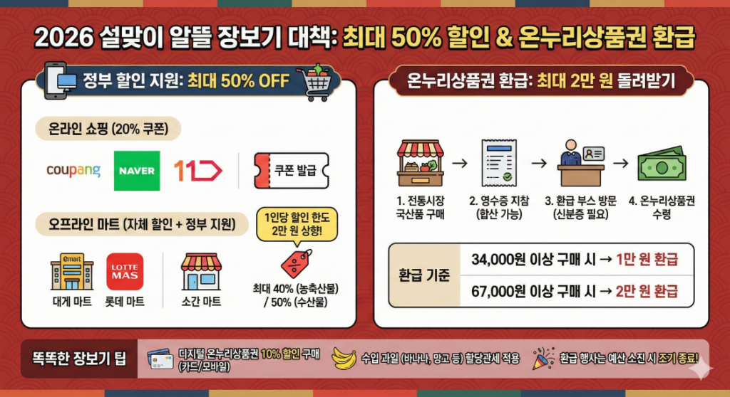 2026년 설 명절 장보기 할인 혜택 총정리해서 말씀 드릴게요. 설 명절이 다가오면서 장볼 돈이 많이 드는데요. 정부에서 역대 최대 규모로 할인 혜택을 준비했습니다. 농수축산물 할인받아서 장보는 방법과 온누리 환급이 얼마가 되는지 쉽게 알려드립니다.